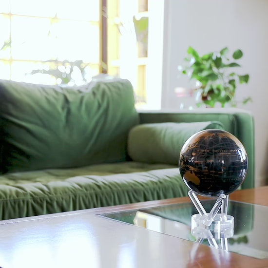 Elevate your space with the stunning Black and Gold MOVA Earth Globe – a masterpiece featuring shimmering gold landmasses against a deep black ocean, perfect for modern décor enthusiasts.