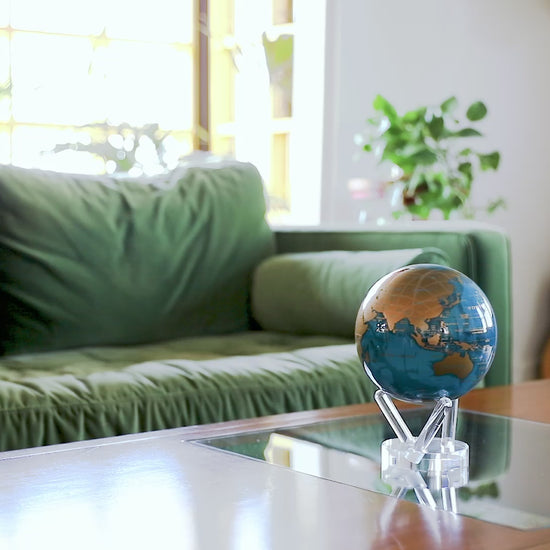 Upgrade your home décor with a bold and modern twist on the traditional world globe. Featuring cerulean blue oceans and shimmering gold metallic landmasses, the Blue and Gold MOVA Earth Globe is the perfect fusion of style and function.
