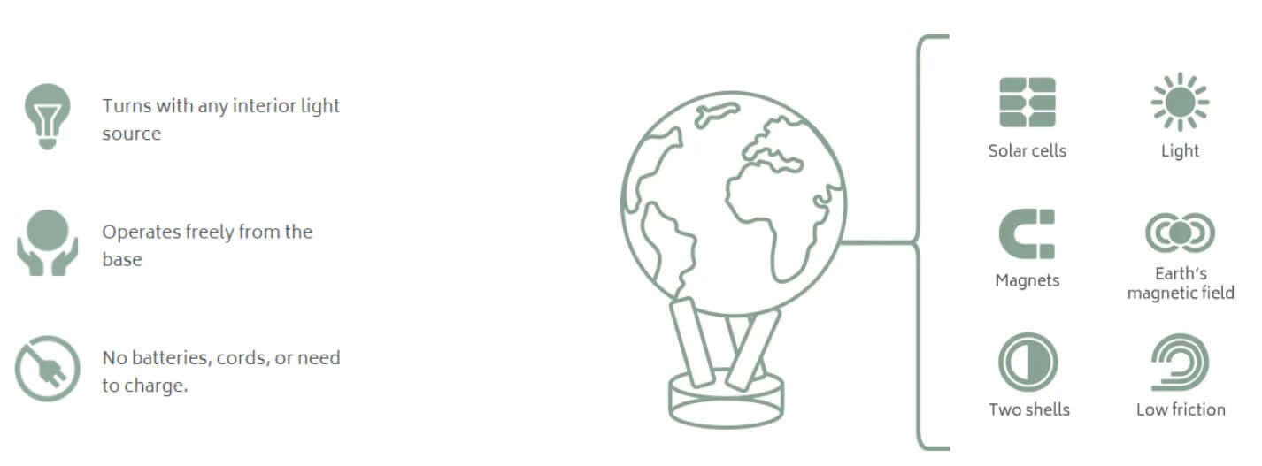 MOVA’s patented technology uses hidden solar cells to absorb ambient light and power a quiet, continuous rotation
